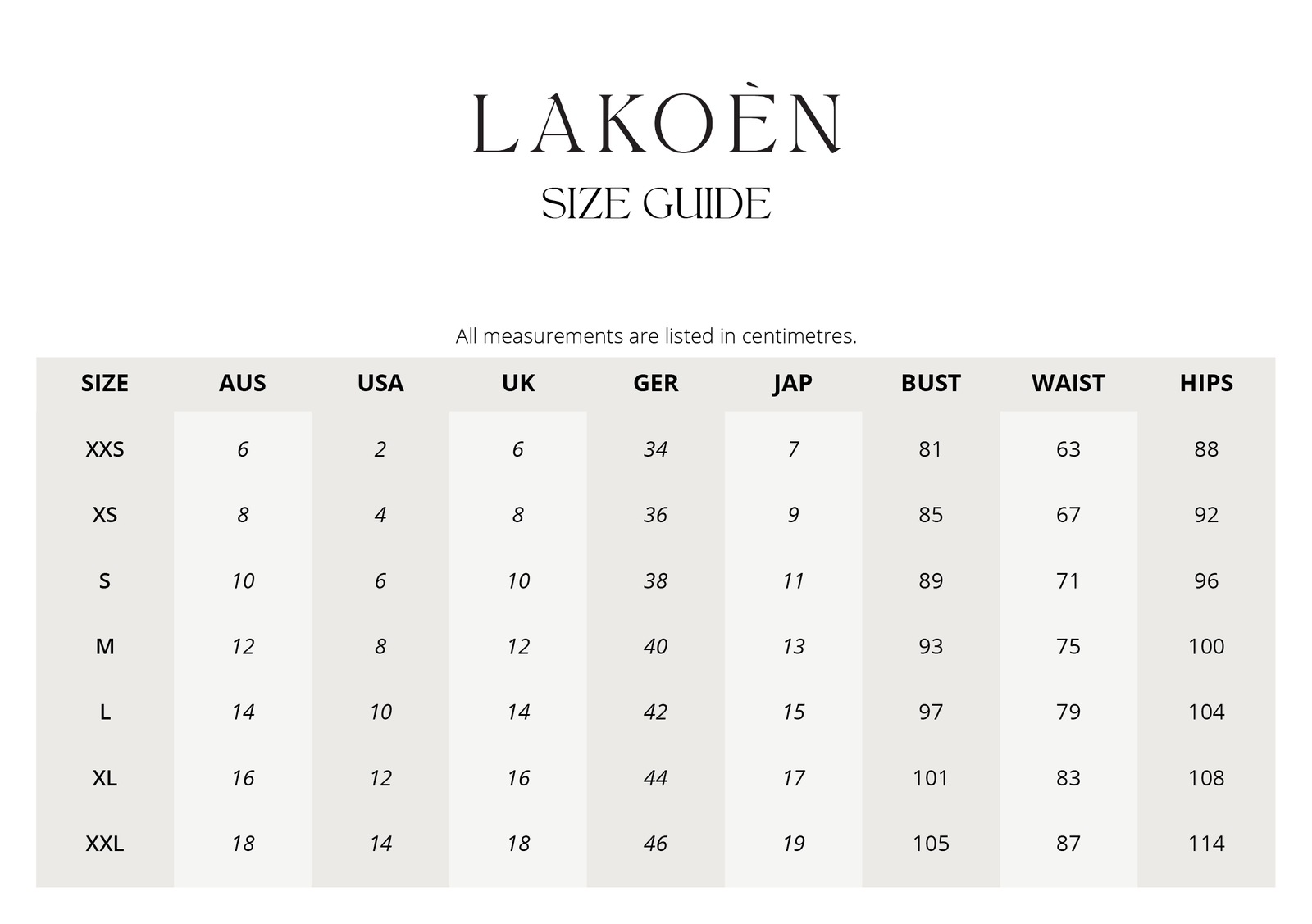 All LaKoèn clothing is available in sizes XXS - XXL. Size XXS is equivalent to standard AU 6.